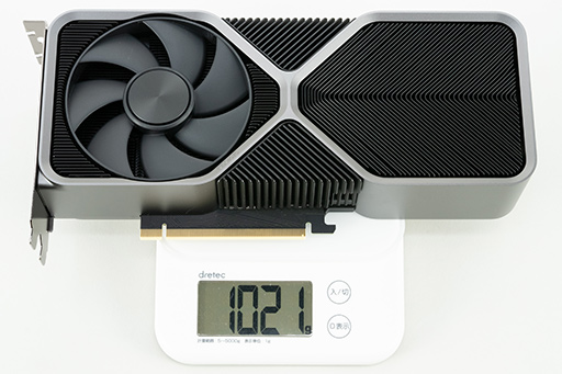 なお,実測重量は約1021gと,ほかのRTX 40シリーズに比べて比較的軽めで,こちらもRTX 3070 Founders Editionの約1038gとほぼ同じだ。