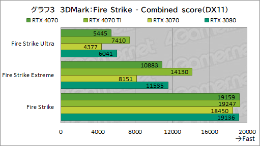 ここではCPUの影響が大きくなるため,Fire Strike“無印”におけるスコアの頭打ちがより顕著となっている。無印以外を見ていくと,RTX 4070がRTX 4070 Tiの74〜77%程度と差が大きくなった。これは,Combined testの負荷が大きく,より実力の差が表れやすくなったと捉えるのがよさそうだ。また,RTX 4070は,RTX 3070に24〜34%程度の差を付けるものの,RTX 3080に対しては6〜11%程度の差を付けられてしまっている。