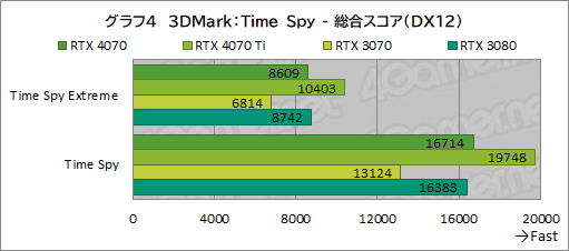 では,DirectX 12のテストとなる「Time Spy」の結果に移ろう。グラフ4は,総合スコアをまとめたものだ。