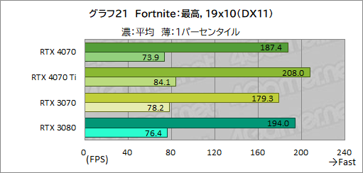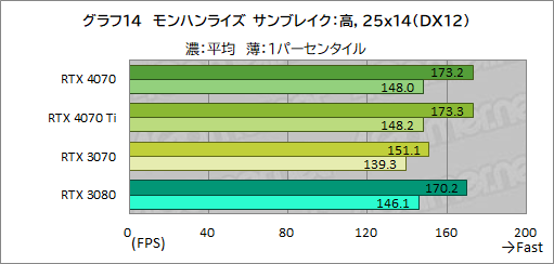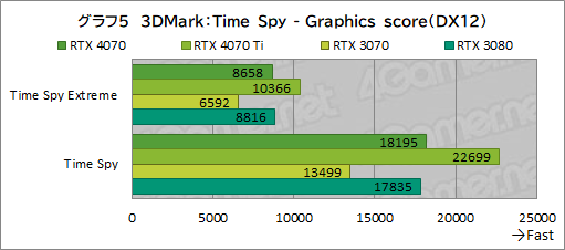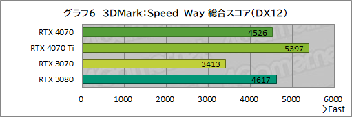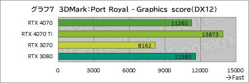 ここでは,CPU性能の影響がなくなるが,RTX 4070のスコアは,RTX 4070 Tiの77〜86%程度に収まっている。RTX 3070に対しても,18〜30%程度と総合スコアよりも差を広げており,RTX 3080相当のスコアを発揮している点は変わらない。