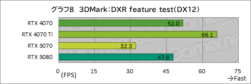 もうひとつのレイトレーシング性能を測るDirectX Raytracing feature testの結果がグラフ8だ。