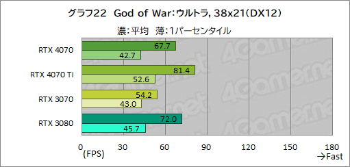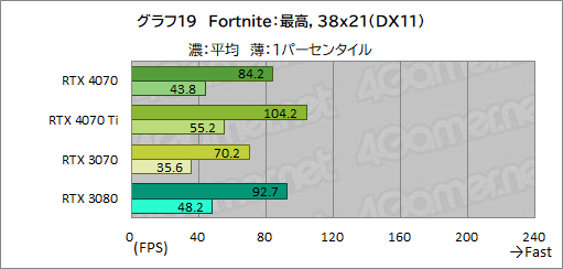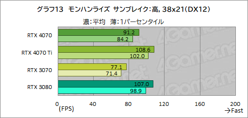 RTX 4070の平均フレームレートは,RTX 4070 Tiの80〜85%程度で,RTX 3070には35〜37%程度もの差を付けた。RTX 3080に対しても,最大で12%の差を付けている点も要注目だ。ただし,3840×2160ドットではRTX 4070とRTX 3080のフレームレートがほぼ横並びになっているのを見ると,やはりRTX 4070は,高解像度ではメモリインタフェースが足かせになる可能性があるということなのだろう。