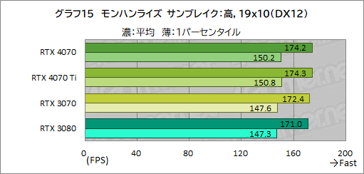 1920×1080ドットではCPUがボトルネックとなり,フレームレートが頭打ちになりつつある。それ以外の解像度を見ていくと,RTX 4070の平均フレームレートは,RTX 4070 Ti比で86〜98%程度と高い。RTX 3070にも24〜33%程度の差を付けており,3〜4%程度だが,RTX 3080を安定して上回っている点は評価できよう。