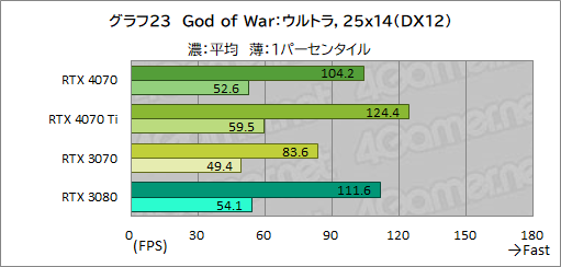 RTX 4070はRTX 4070 Tiの83〜85%程度といったところ。RTX 3070には26〜27%の差を付けて,RTX 3080と肩を並べているあたりは,Fire Strikeと似た傾向だ。