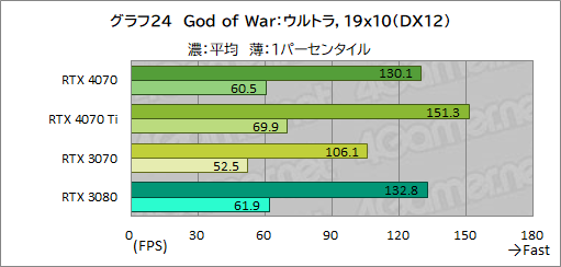 RTX 4070の平均フレームレートは,RTX 4070 Tiの79〜86%程度で,RTX 3070を29〜36%程度引き離している。また,RTX 3080には3〜4%程度届いていないが,その差は実フレームレートで2〜4.5fpsなのでほぼ横並びと言っていいレベルだ。最小フレームレートは,平均フレームレートと同じ傾向で,RTX 4070は,2560×1440ドットでも80fpsに迫る勢いを見せている。