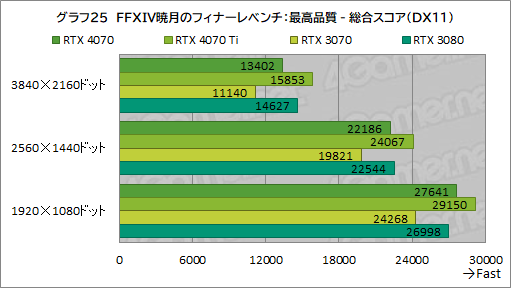スクウェア・エニックスに指標では,スコア1万5000以上で最高評価とされているが,RTX 4070は3840×2160ドットでそれに届いていない。NVIDIAがRTX 4070で,1440pでのゲームプレイを想定しているというのもうなずける結果と言えよう。