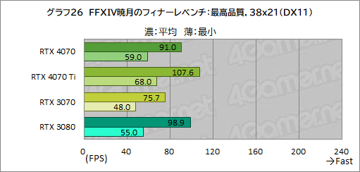 平均フレームレートは,総合スコアを踏襲した形となっており,RTX 4070は2560×1440ドットでも150fpsを超えている点は立派だ。一方,最小フレームレートは,CPU性能の影響が大きく,あまり差が付いていない結果となった。それでもRTX 4070は,3840×2160ドットで最小が60fpsに迫っている点は評価できる。