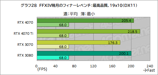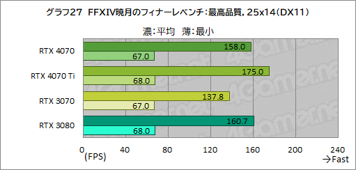 そんなFFXIV暁月のフィナーレ ベンチにおける平均フレームレートと最小フレームレートをまとめたものがグラフ26〜28だ。