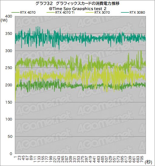 このグラフを見ると,RTX 4070の消費電力は200W前後で推移しており,4製品の中で最も低いことが見てとれよう。とくに,RTX 3080との差はかなりのもので,消費電力の低さはかなりインパクトがある。