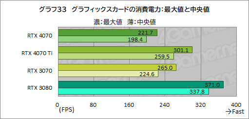 RTX 4070の中央値は約198Wほどで,RTX 4070 Tiと比べて約61Wも低く,RTX 3070よりも約26W低い点は好印象だ。最大値を見ても,RTX 4070は約221Wまでしか上がっておらず,やはり消費電力はかなり低めだ。