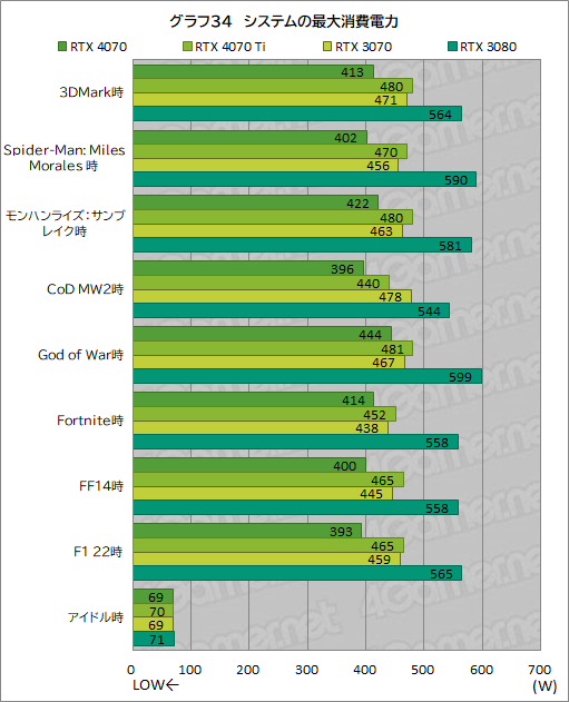 先述したようにRTX 4070のTGPは200Wと,RTX 4070 TiやRTX 3080から消費電力は大幅に低減している。実際の消費電力が,NVIDIAのアピールどおりなのかが気になるところだ。