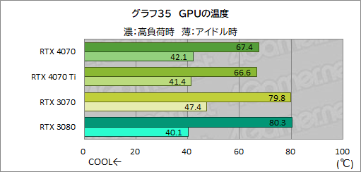RTX 4070は,高負荷時でも70℃を切っており,RTX 3080やRTX 3070の前世代のGPUと比べると温度はかなり低めだ。消費電力も低いことを踏まえると,発熱もさほど大きくないと捉えるのが妥当だろう。