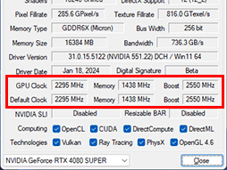 後述するテスト環境において,負荷をかけた状態のコアクロックを「GPU-Z」(Version 2.57.0)で追ってみたところ,RTX 4080 SUPER FEでは2730MHzまで,Palit 4080 SUPER OCでは2760MHzまで,それぞれ上昇しているのを確認した。同様のテストで,RTX 4080は2775MHzまで上がっていたのと比べると,回路規模が大きくなった影響か,動作クロックの上がり幅が若干減少している。