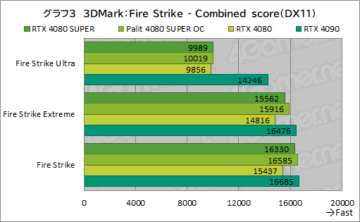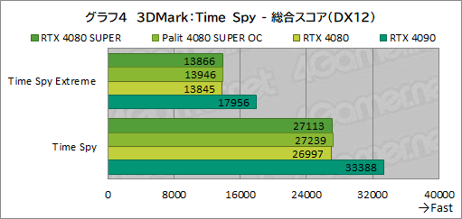 Palit 4080 SUPER OCは,RTX 4080 SUPERとほとんど同じスコアで,クロックアップの効果はあまりない。