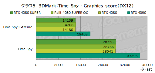 Palit 4080 SUPER OCはRTX 4080 SUPERからスコアがあまり伸びておらず,クロックアップの効果はあまりない。