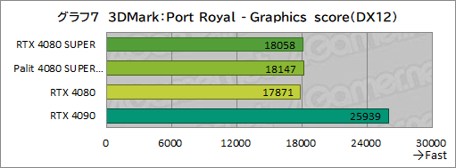 ここでは,RTX 4080 SUPERがRTX 4080を3%ほど離し,Port Royalより差が開く傾向となった。RTX 4090との開きも58%にも達しており,上位モデルにはまったく届いていない。また,ここでもPalit 4080 SUPER OCの伸びは芳しくなく,RTX 4080 SUPERからあまり変わっていない。