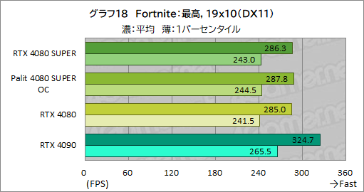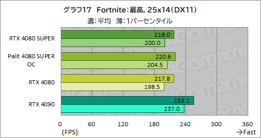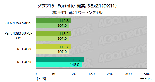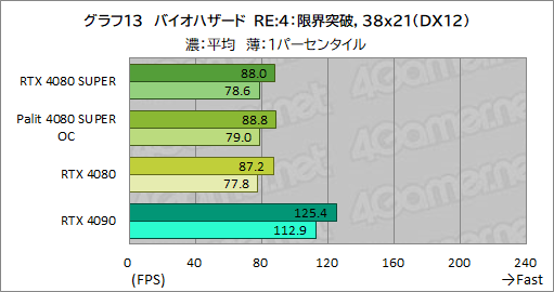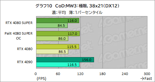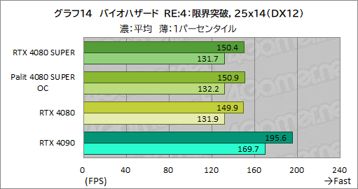 ここでも,RTX 4080 SUPERの平均フレームレートは,RTX 4080とほぼ同じ。1パーセンタイルフレームレートも,差が1fpsもなく,横並びの性能と言っていい。