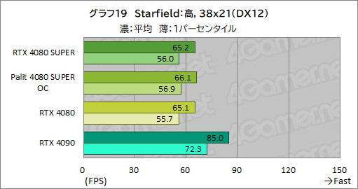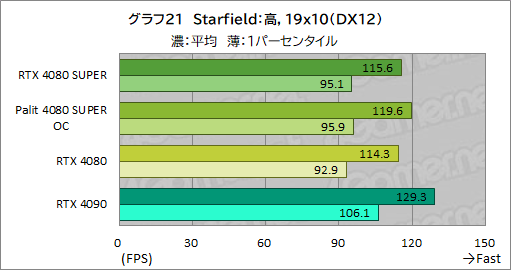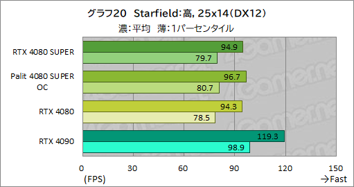 Starfieldでも,RTX 4080 SUPERの平均フレームレートは,RTX 4080とほぼ同じ。ただ,1パーセンタイルフレームレートが最大でRTX 4080から約2%ほど向上しており,RTX 4080 SUPERのほうが若干高性能と言えなくもない。