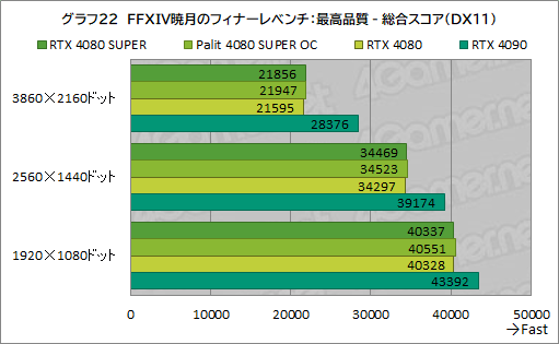 CPUがボトルネックとなるため,1920×1080ドットではスコアが4万4000程度で丸まりつつある。そこで,それ以外の解像度を見ていくと,RTX 4080 SUPERはRTX 4080から最大約1%伸びているものの,差はほとんどないと言っていい。また,スクウェア・エニックスが示す指標では,スコア1万5000以上が最高評価とされているが,RTX 4080 SUPERは,3840×2160ドットでもそれを大きく上回っており,快適にプレイできそうだ。