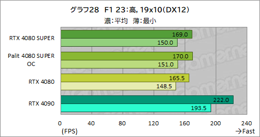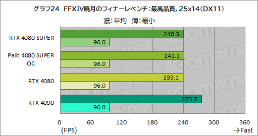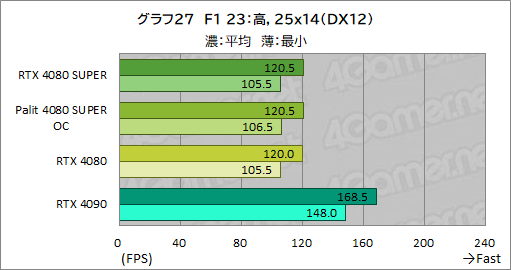 ここでも,RTX 4080 SUPERの平均フレームレートは,RTX 4080からほとんど伸びていない。最小フレームレートも,最大約1.5fps向上している程度で,あまり変わっていない。Palit 4080 SUPER OCの平均フレームレートは,RTX 4080 SUPERから1%伸びるのがやっとで,やはり大勢に違いはない。ただ,最小フレームレートを見ると,2560×1440ドットでRTX 4080 SUPERから約2%強向上しており,クロックアップの効果も垣間見える。