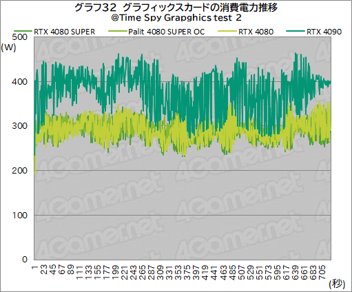 この結果を見ると,RTX 4090が頭ひとつ抜きんでているが,RTX 4080 SUPERとRTX 4080,それにPalit 4080 SUPER OCでは,消費電力があまり変わらない感じだ。いずれも,300Wあたりで推移しているように受けられる。