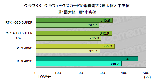 RTX 4080 SUPERの中央値は約287.7Wで,これはRTX 4080より2W低いものの,ほぼ横並びと言っていいレベル。ただ,最大値を見ると,RTX 4080 SUPERはRTX 4080より約8Wほど低く,瞬間的な消費電力の増大をRTX 4080 SUPERは抑えている印象だ。