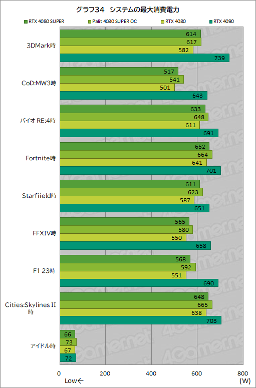 各ゲーム実行時において,RTX 4080 SUPERのほうが,RTX 4080よりも10〜32W程度高くなっている。このテストでは,ピーク値を結果として採用するため,どうしても差が大きくなる傾向がある。しかし,それを考慮しても,RTX 4080 SUPERのほうが,RTX 4080より若干消費電力は高いと言えそうだ。