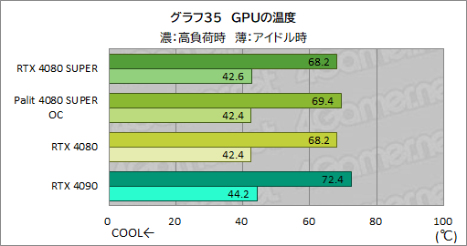RTX 4080 SUPERは,高負荷時でも70℃以下に収まっており,GPUクーラーの冷却性能は申し分のない出来だ。Palit 4080 SUPER OCも,高負荷時で70℃を超えることはなく,こちらも冷却性能は優秀だ。