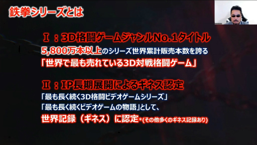 鉄拳シリーズの世界累計販売本数は5800万を超えており,「世界で最も売れている3D対戦格闘ゲーム」となっている。2024年で初代「鉄拳」の稼働から30周年を迎える息の長いシリーズだけあって,「最も長く続く3D格闘ビデオゲームシリーズ」「最も長く続くビデオゲームの物語」など,ギネスに認定された記録も多く,ギネスの公式サイトで「TEKKEN」を検索すると1232件もヒットするとのこと。