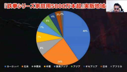 人気格闘ゲームとしてゲーマーなら知らない者はいないほどの存在になっている鉄拳シリーズだが,日本で生まれたにもかかわらず,日本での売り上げは全体の3%ほどしかない。ヨーロッパが40%,北米が24%を占め,中東やオセアニアの割合も日本より大きいという,完全なワールドワイド型のタイトルとなっている。