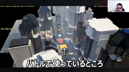 講演では「鉄拳8」(PC / PS5 / Xbox Series X|S)のニューヨークステージが例として紹介された。下の画像がそれだが,ゲーム中で対戦キャラが動き回るスペースは黄色の部分のみ。もちろんそこから遠くなるほどに細かい描写は減っていく傾向はあるが,それでもかなりのクオリティだ。