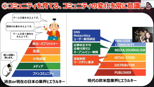 鉄拳がコミュニティを重視してきたことを説明するにあたって,原田氏は「日本と海外のゲーム業界におけるヒエラルキー」を表す図を提示した。それが下の画像だ。