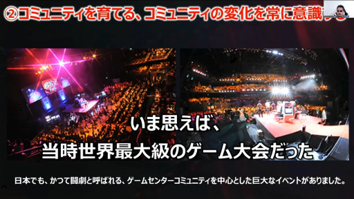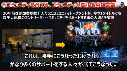 ファンコミュニティ自体も,地域によって違いがある。歴史的に見ると,日本やアジアはアーケード拠点型で,欧米を中心とした海外はLANパーティーや地域大会を中心にコミュニティが形成されてきた。