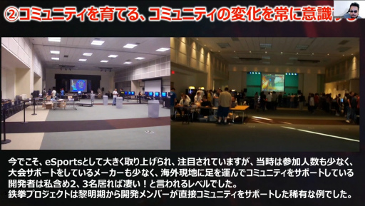 ただ,こういった活動は社内外からの評価を得ることが難しく,苦労は多かったようだ。原田氏は,最近になってeスポーツに参入してくる人や企業にも思うところはあるようで,参加者が徐々に増えて,そこにキーワードができて爆発した結果,到達している場所であることや,鉄拳の開発チームが裏方として地道に活動してきたことが理解されていないと訴えた。