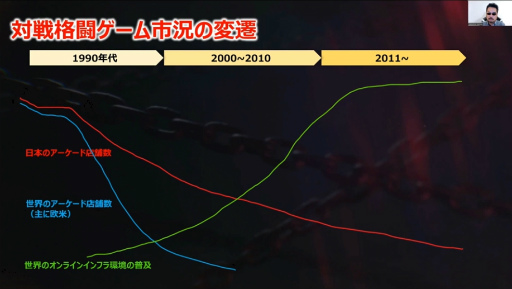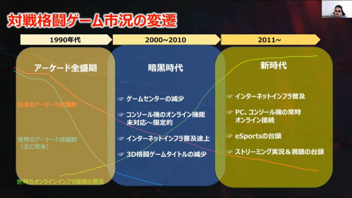 その一方でインターネットは普及の途上にあり,家庭用ゲーム機も含めてオンライン対戦など夢のまた夢といった時代でもあった。そのため,名だたる格闘ゲームシリーズが2000〜2010年の間に消えてしまっている。原田氏はここを「暗黒時代」とした。