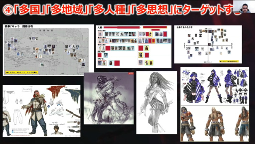 鉄拳シリーズをプレイしたことがある人なら,参戦キャラクターを見ただけで「多国」「多地域」「多人種」「多思想」が感じられるだろう。原田氏はその狙いを説明するために,「層」と「域」というキーワードを提示した。