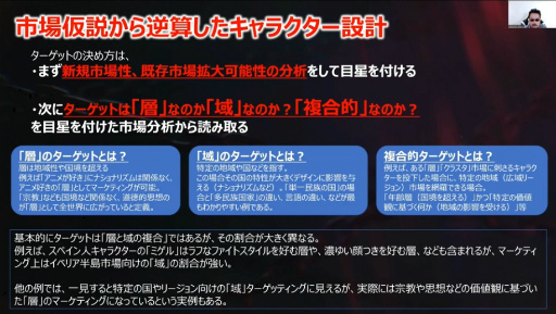 鉄拳では,こういったところから“逆算”してキャラクター設計を行うこともあるという。もちろん「層」または「域」だけで作られたキャラクターはないが,その割合は大きく異なるとのことだ。