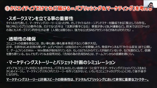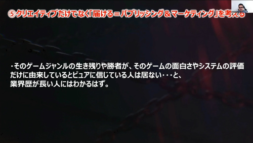 そして,良いことも悪いことも基本発信したほうがいいとのこと。このゲームが売れている/売れていない,この要素は受けない/受けたなどを,しっかりとコミュニティに伝えることが必要になる。