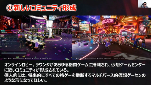 原田氏は「僕の勝手な夢」と断りを入れつつも,このラウンジをタイトルで分断されているものではなく,共通のものにできないだろうかと話した。まさにゲームセンターや大会のように格闘ゲーム好きが集まり,そこから筐体に座って対戦する……といった空間を作れないかというわけだ。