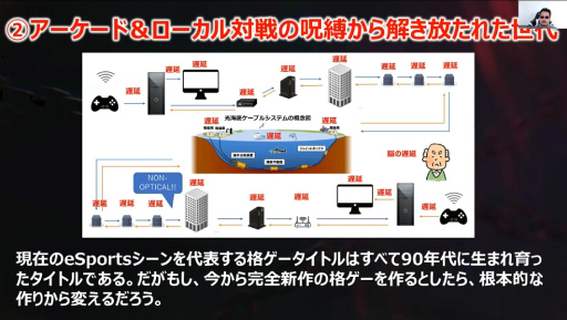 原田氏が現在の格闘ゲームにおいて,大きな問題と考えているのが遅延だ。下の画像に描かれているように,ネット接続だけでなく,コントローラと本体間,本体とディスプレイ間など,ありとあらゆるところで遅延が発生している。