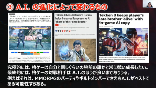 鉄拳シリーズはプレイヤーの癖を学習するAIを搭載しているが,原田氏は鉄拳プレイヤーの弟を亡くした方から「弟のAIを残せませんか」という依頼を受けたエピソードを交えつつ,人の想いや人格的なものがAIの形で残せると説明した。