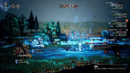 調合できる素材の数はブーストによって増加し、組み合わせ次第ではパーティー全体を一挙に万全な状態へ回復することもできる。