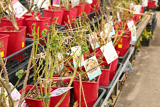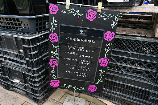 通常,バラが咲く季節は春のようですの。一季咲き,二季咲き,四季咲きは品種ごとにさまざまですし,ビニールハウスなどで温度管理されたものも別ですし,併設されている店舗内には生花店もございますけれど。こちらではより自然な「苗」で提供されているそうです。