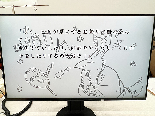 キツネくんが吹いた笛の音がタヌキくんの場面でも聞こえるなど,それぞれのルートで選択した出来事が別のルートにも影響を与える。用語をクリックすると詳しい説明を読めるなど,デジタルゲームらしい要素をしっかり備えていた。2023年中にリリース予定とのこと。