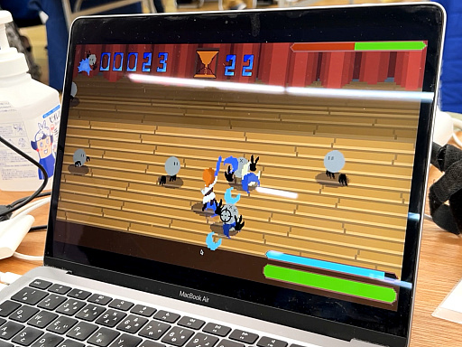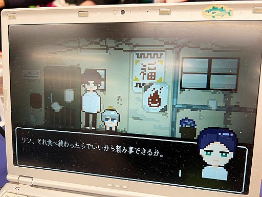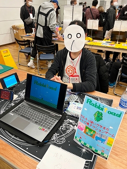 自作のお面と,ドリームキャストのロゴが描かれたTシャツがインパクト大で足が止まったブース。出典していた作品は「カエルのように見えてじつはウサギ」というキャラクターが活躍する,ジャンプだけでゴールに向かうアクションゲームだ。本来はマウスで操作するゲームだが,タッチパッドでプレイすることとなったため,かなり難度が高く感じた。