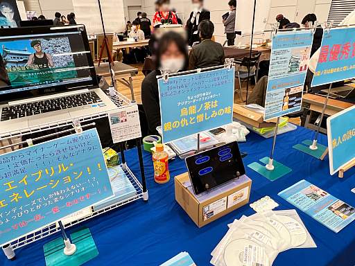 書籍「Unity&宴ノベルゲーム開発入門」(工学社)の出版時に催されたコンテストで最優秀賞を受賞したという「烏龍ノ茶は親の仇と憎しみの味」と,過去作「エイプリル・ジェネレーション」を展示していた旅人の詩Gamesブース。