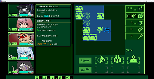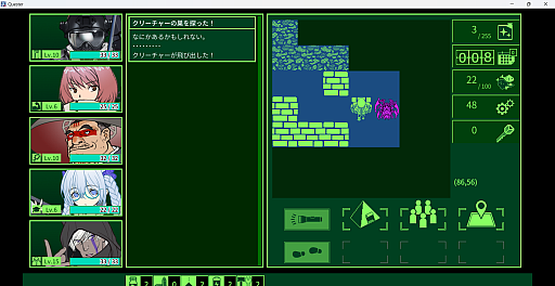 ![]() 画面の左端にパーティーメンバー,その右にアイテム入手などの行動ログ,右側にダンジョンのマップや実行できるコマンドが配置されている |