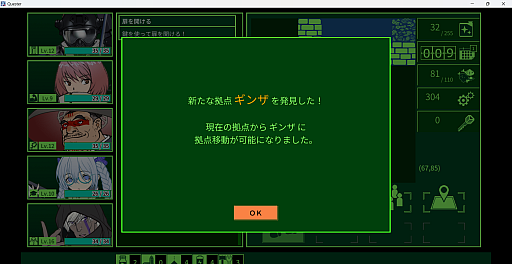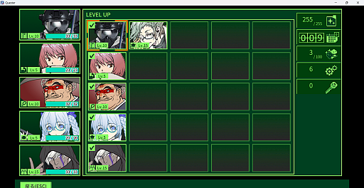 ダンジョンを探索するパーティーは,5人のクエスターで編成されている。初期メンバーは,ハルカ(乱暴者),ドブロク(和尚),リサ(博士),エッジ(泥棒),ゴッツ(機動隊)で,かなりバランスがいい感じだ。