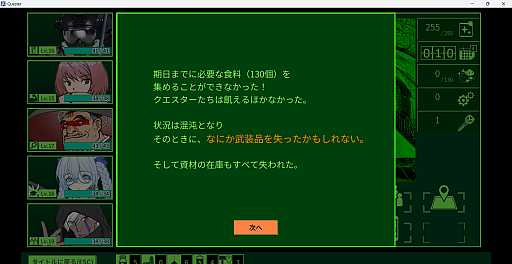 なお戦闘中に,パーティーが全滅すると強制的に拠点に戻される。現在所持している食料と資材が半分になり,クエスターの経験値も,現在のレベル上がりたて状態まで戻されるので,注意が必要だ。食料確保の失敗と同様に,避けたい状況である。