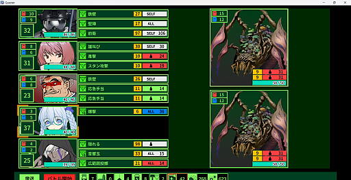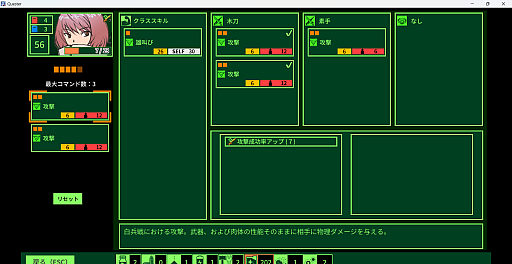 攻撃はターン制で,各ターンの初めにクエスターごとに行動(コマンド)を選んでおく。選べるコマンドは,先に述べたように「装備に付与されているもの」と「固有のスキル」だ。